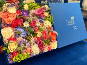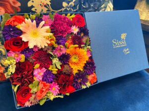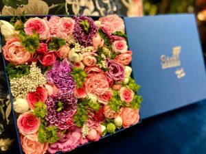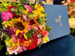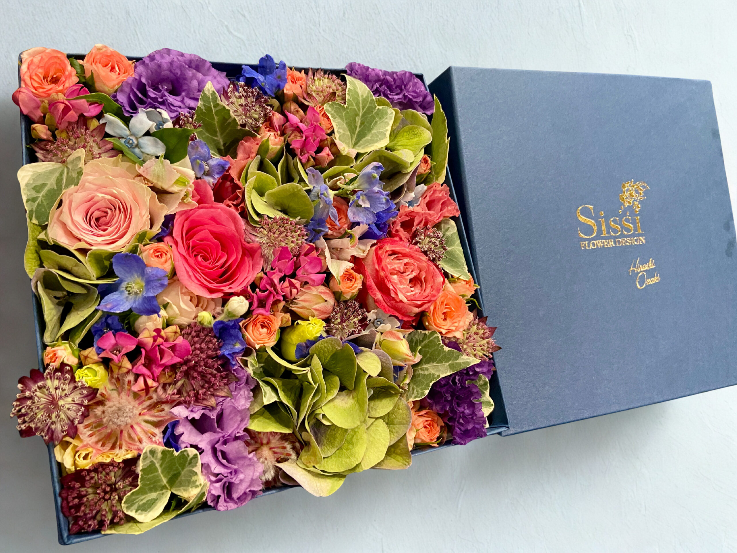 Sissiオリジナルボックスに贅沢にお花を敷き詰めました。 蓋を開けた瞬間に見えるお花に感動をお約束します。 Sissiのオリジナルボックスは高級感あるネイビーに横長の形で従来のボックスフラワーに比べて高級感があります。 男女問わず、色んなご用途のギフトとしてお贈りいただけます。 花の方は基本おまかせにさせていただいておりますが、ご要望があればお伝え下さい。 商品サイズ:縦19.5cm 横19.5cm 奥行8cm *アレンジメントは生花ですので、仕入れの状況などにより花材が変更になりますのでご了承下さい。 (お日にちに余裕をもってご注文くださればご希望により近いお花を制作させていただきます。)