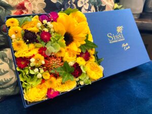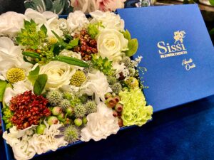 Sissiオリジナルボックスに贅沢にお花を敷き詰めました。 蓋を開けた瞬間に見えるお花に感動をお約束します。 Sissiのオリジナルボックスは高級感あるネイビーに横長の形で従来のボックスフラワーに比べて高級感があります。 男女問わず、色んなご用途のギフトとしてお贈りいただけます。 花の方は基本おまかせにさせていただいておりますが、ご要望があればお伝え下さい。 商品サイズ:縦15.5cm 横15.5cm 奥行7.4cm *アレンジメントは生花ですので、仕入れの状況などにより花材が変更になりますのでご了承下さい。 (お日にちに余裕をもってご注文くださればご希望により近いお花を制作させていただきます。)